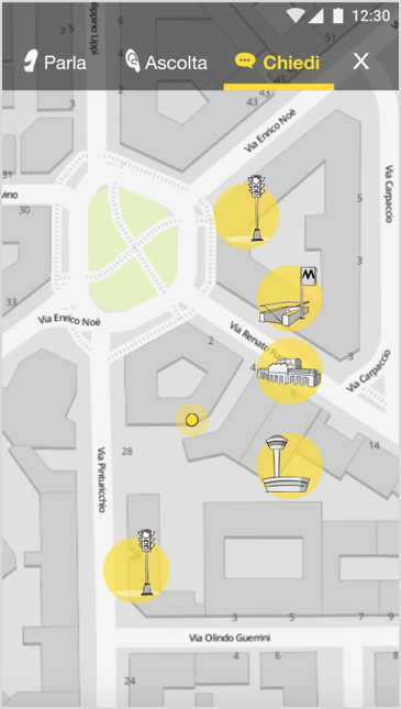 L'applicazione permette all'utente di simulare in modo ludico l'esperienza del cittadino. L'utente all'interno dell'applicazione può interagire con gli oggetti della città segnalati sulla mappa rispondendo a domande, ascoltandoli e chiedendo loro informazioni.