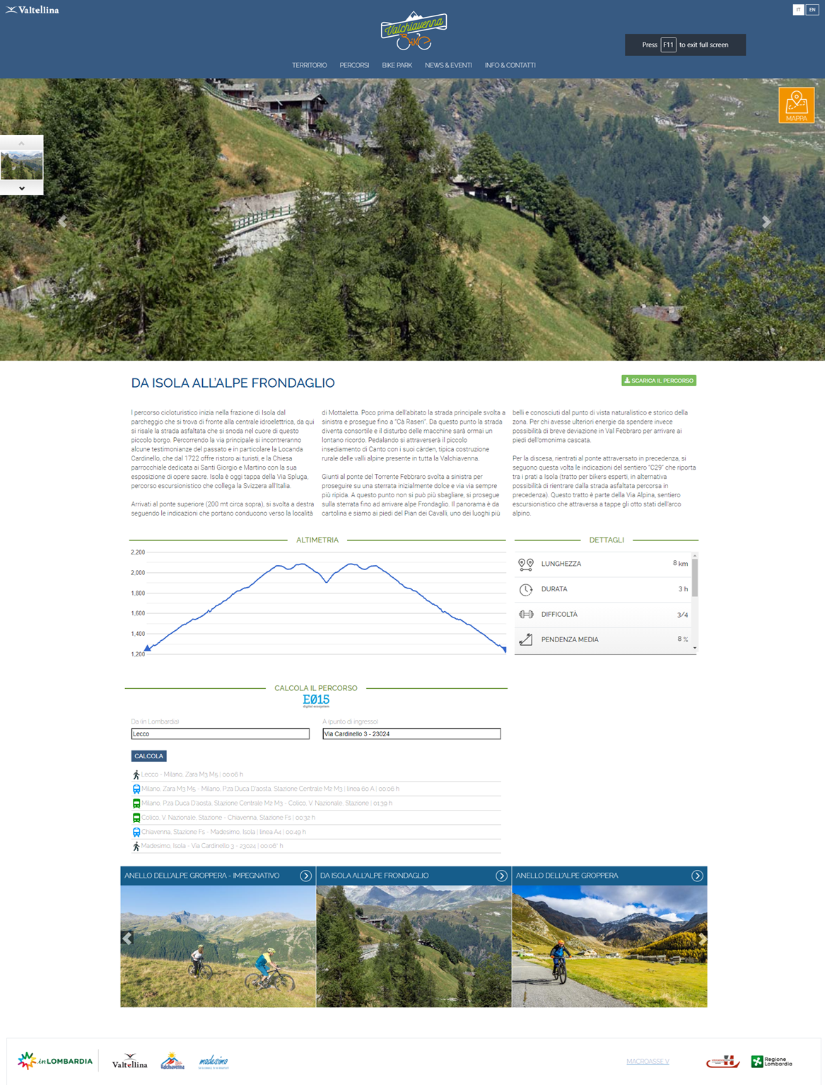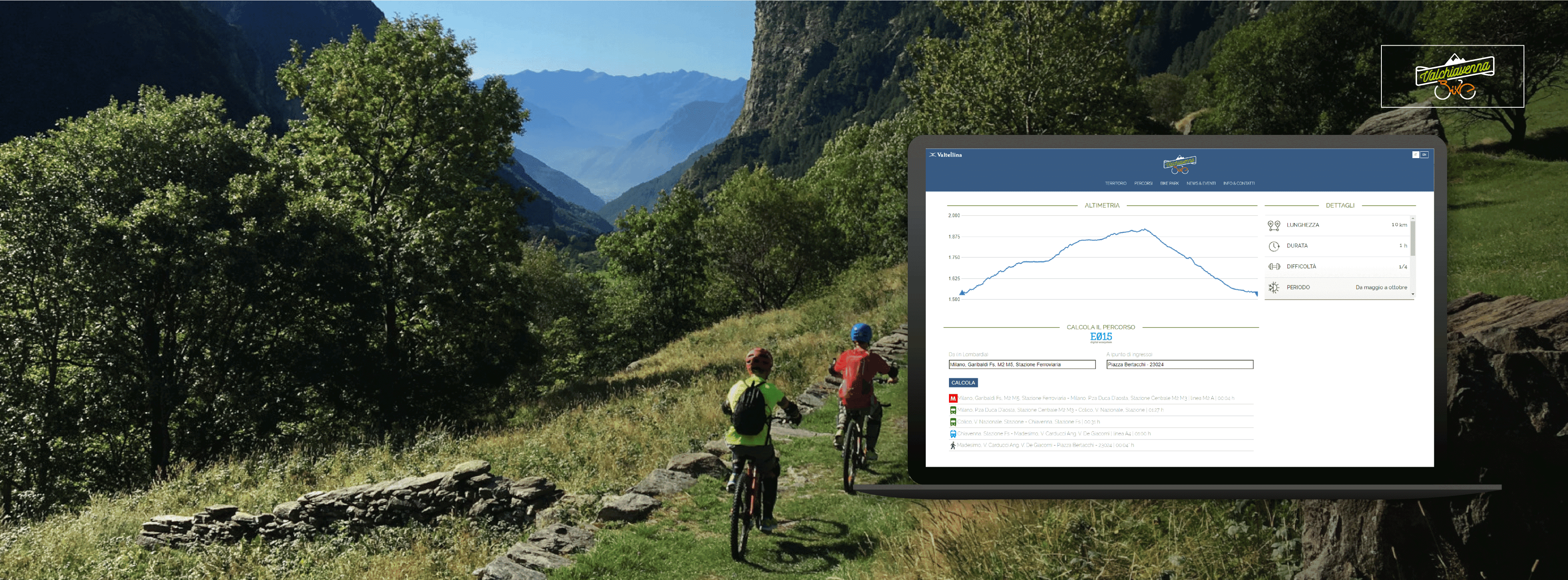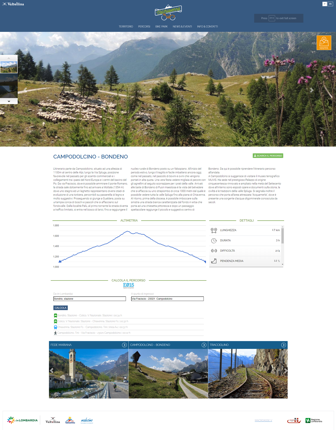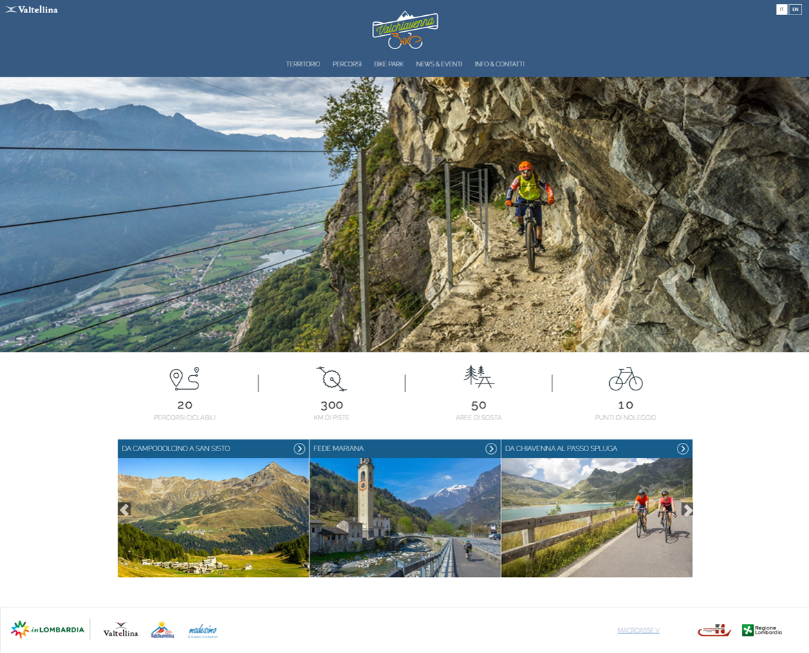 Il sito della Valchiavenna dedicato al mondo bike grazie alla partecipazione all'Ecosistema digitale E015 vuole arricchire il sito www.valchiavennabike.it con dettagli sulla mobilità regionale per supportare gli utenti del sito nei loro spostamenti con i mezzi pubblici.