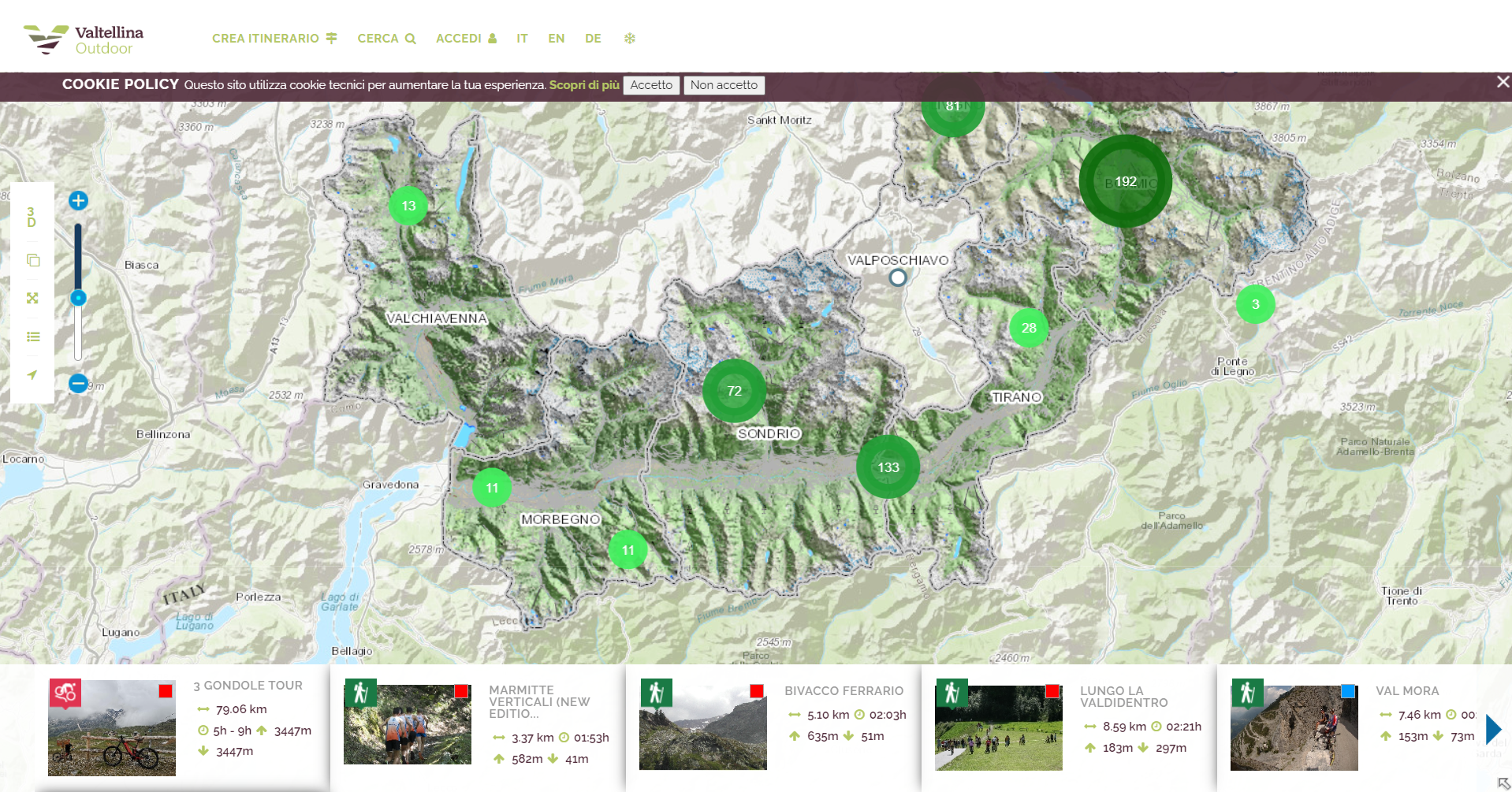 ValtellinaOutdoor è un'applicazione WEB per la consultazione e distribuzione dei dati escursionistici della Valtellina. Attualmente il database è completo per tutta la Valtellina, ad eccezione del mandamento di Morbegno che sta completando l'inserimento dei dati .