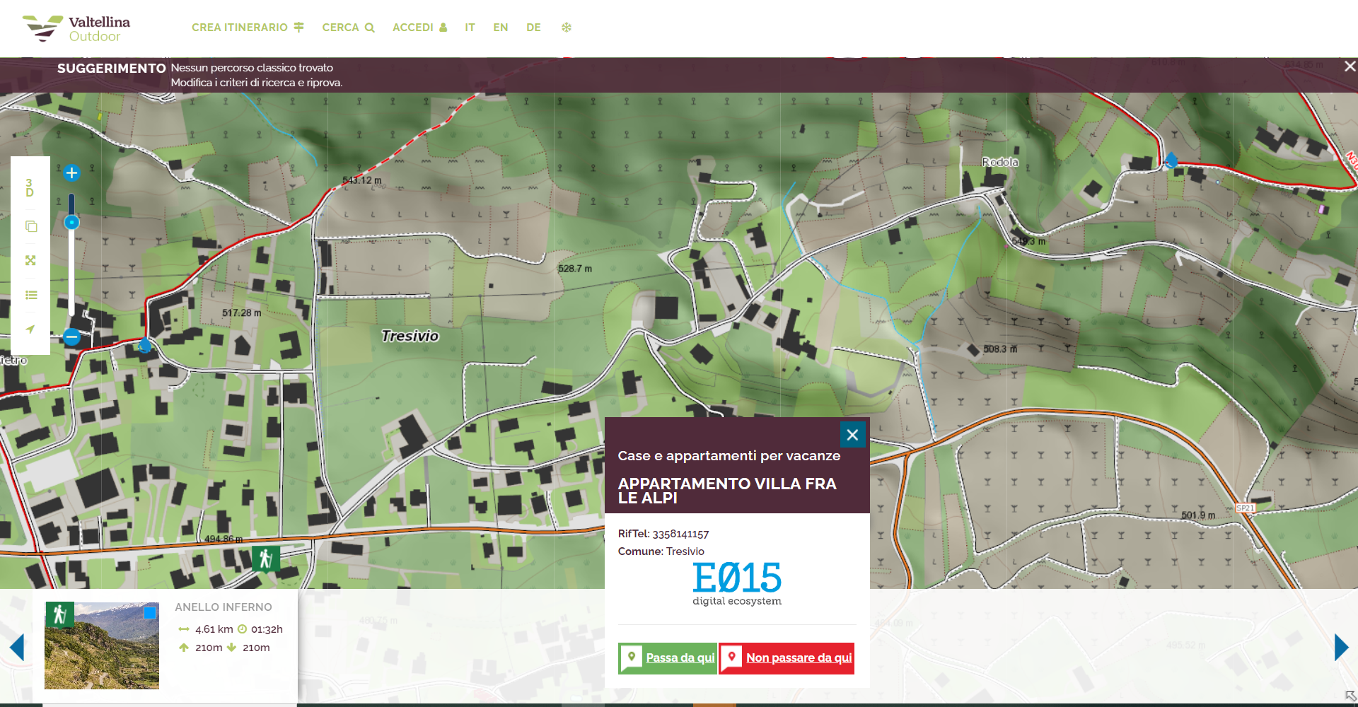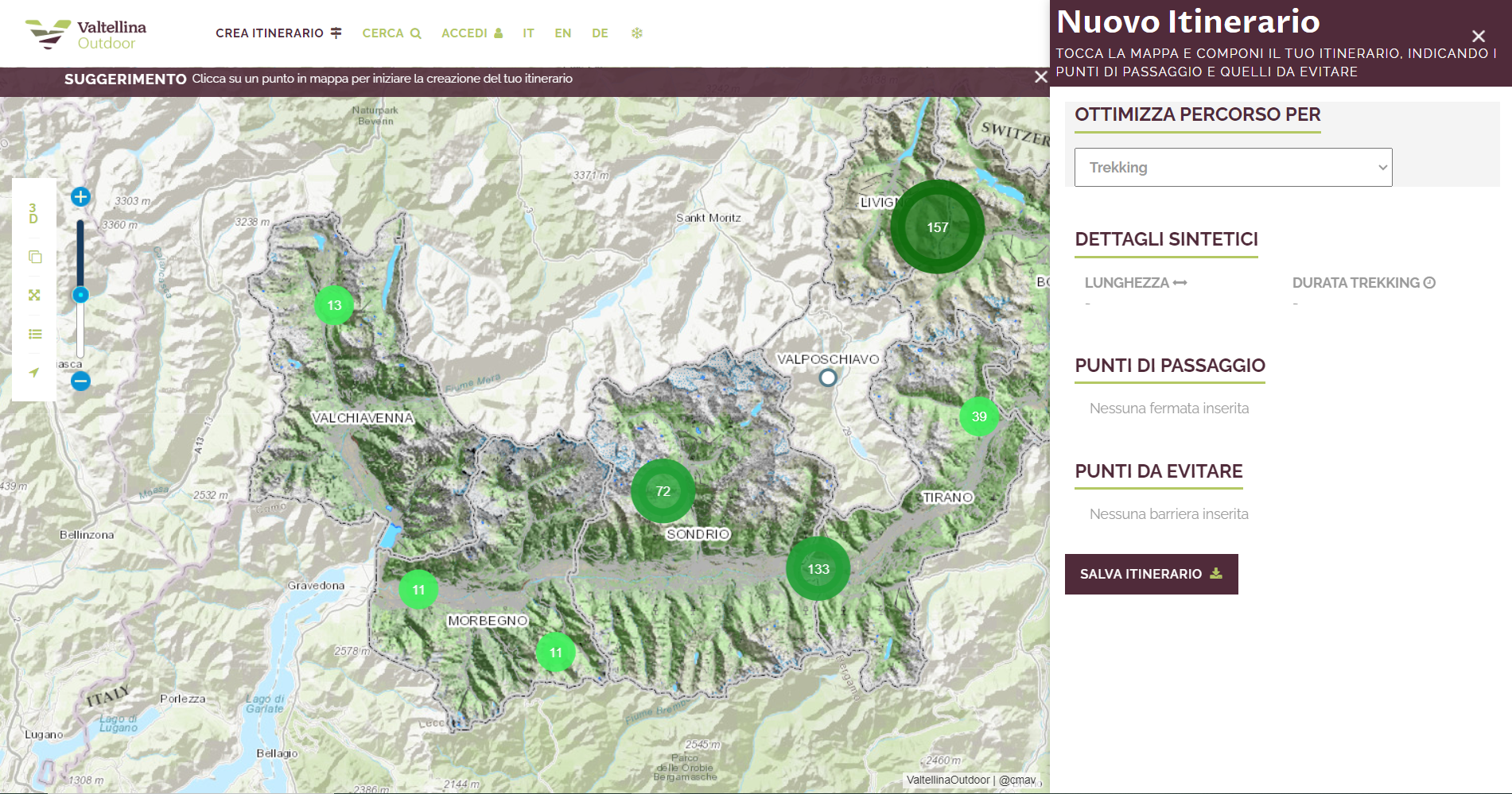 Il sistema permette la consultazione sia da Web che app Android ed IOS della cartografia escursionistica e di tutti gli itinerari proposti dagli enti turistici e la creazione di itinerari personalizzati. Gli stessi possono essere scaricati come file gpx/kml oppure salvati sulla app per l'utilizzo Offline. La banca dati escursionistica è completata e valorizzata dai POI, quali Strutture ricettive, DAE, punti culturari, punti sportivi, punti panoramici ed in generale di tutto quello che può generare interesse al territorio.