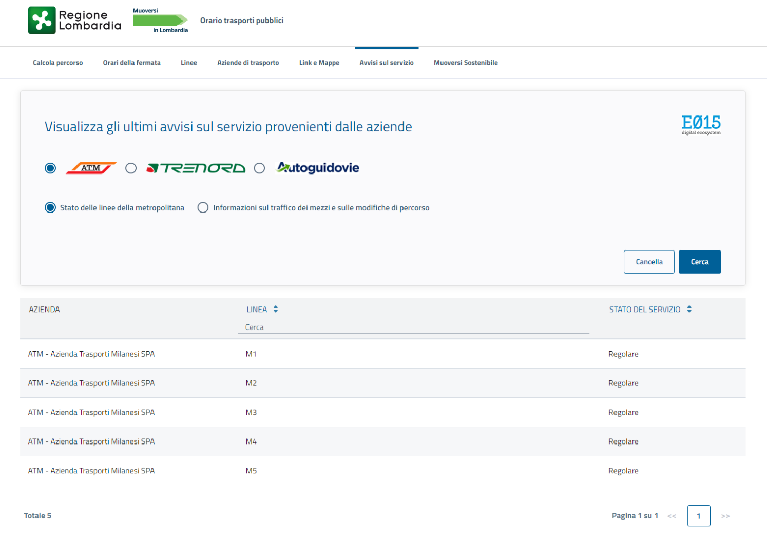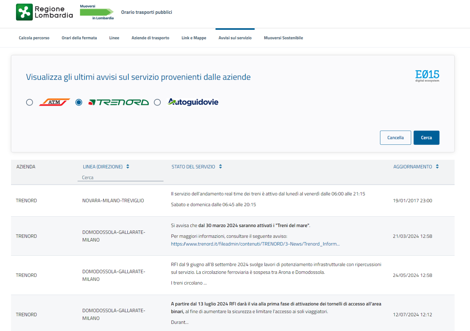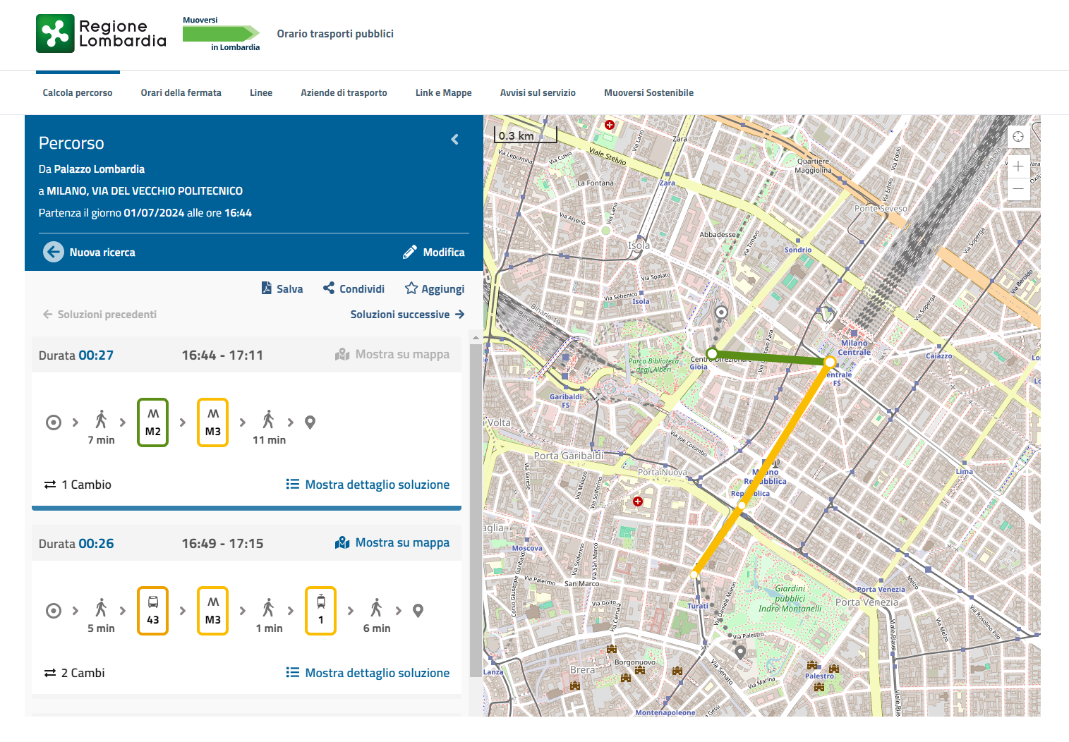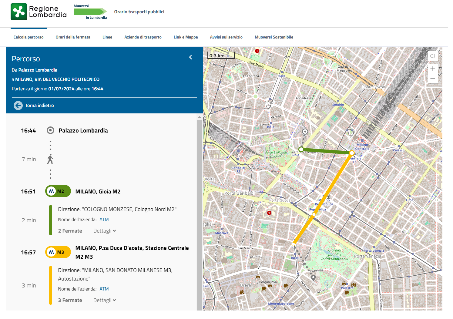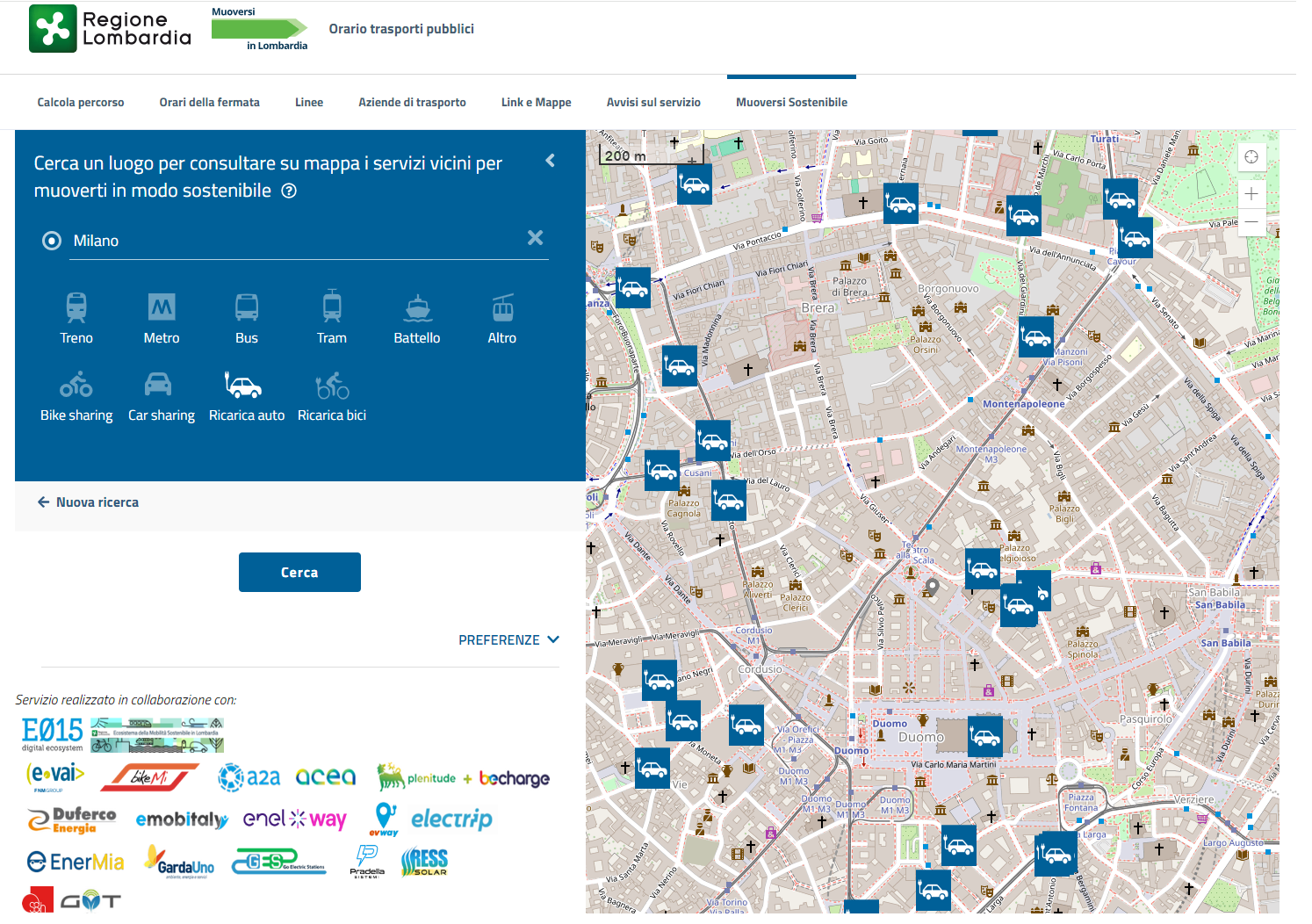 Muoversi in Lombardia è uno strumento messo a disposizione di tutti i cittadini da parte di Regione Lombardia, che fornisce soluzioni di viaggio intermodale utilizzando il trasporto pubblico in Lombardia. Le informazioni contenute nel sito sono messe a disposizione direttamente dalle aziende che operano sul territorio regionale, e integrate anche grazie alle API pubblicate sull’ecosistema digitale E015, all’iniziativa ECOMOBS (ECOsistema della MOBilità Sostenibile) di Regione Lombardia e ai servizi resi disponibili da alcuni operatori di mobilità.