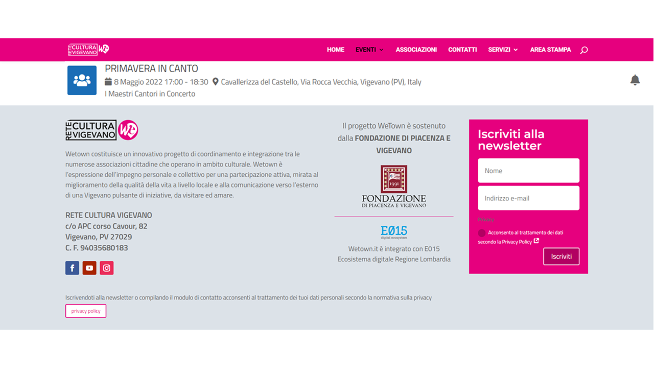 Wetown costituisce un innovativo progetto di coordinamento e integrazione tra le numerose associazioni cittadine che operano in ambito culturale. Wetown è l’espressione dell’impegno personale e collettivo per una partecipazione attiva, mirata al miglioramento della qualità della vita a livello locale e alla comunicazione verso l’esterno di una Vigevano pulsante di iniziative, da visitare ed amare.