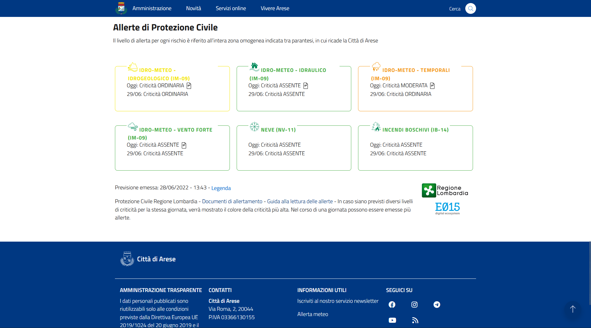 Il servizio relativo alle interconnessioni con l'API E015 "Allerte Protezione Civile" è attivo nei comuni di: