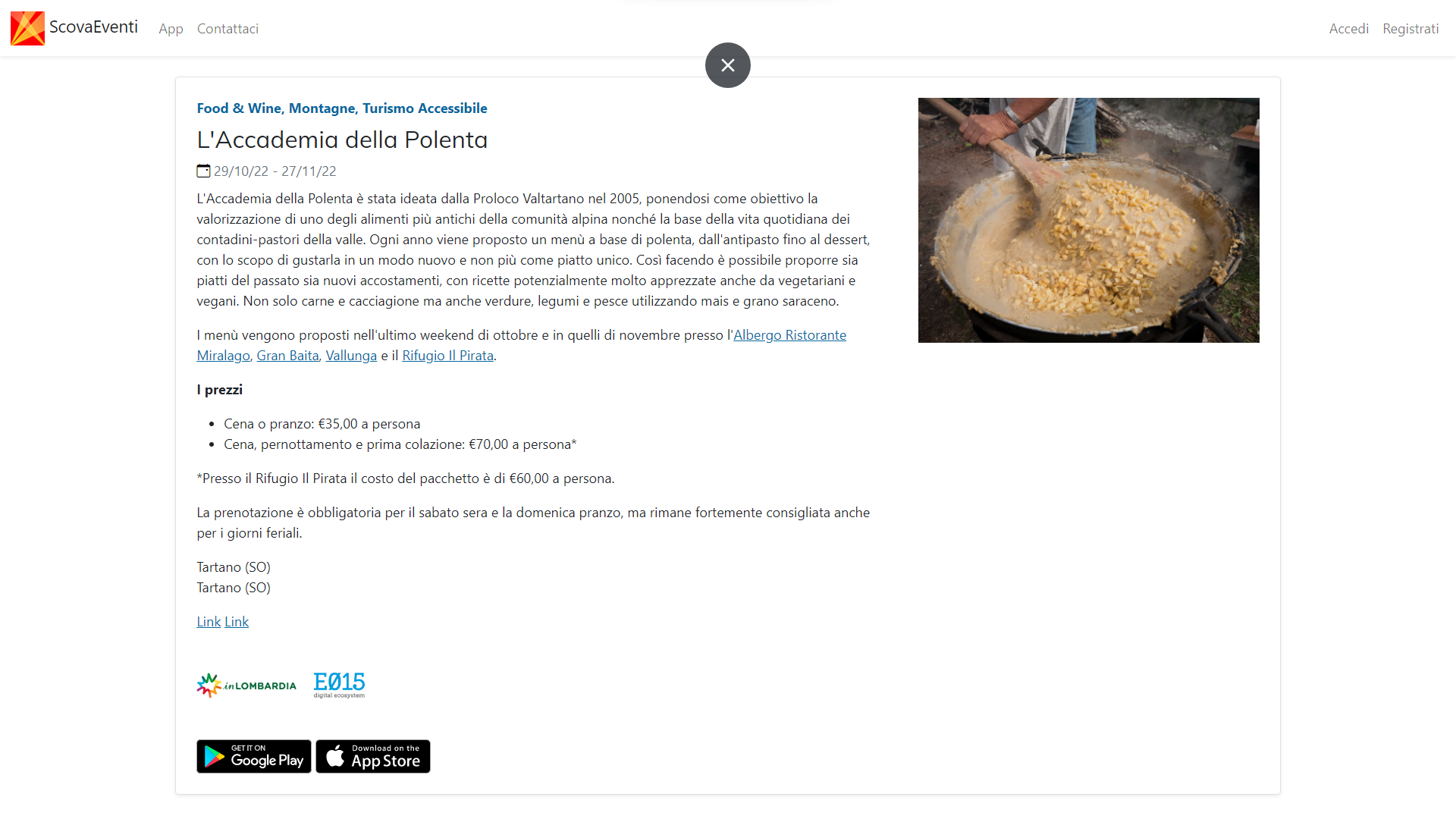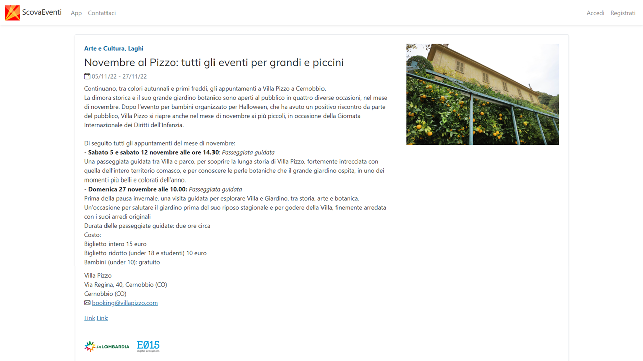 Il portale www.scovaeventi.it affianca l’app ScovaEventi, disponibile per Android e iPhone, nell’offrire un servizio di aggregazione degli eventi che si svolgono nel territorio Lombardo, in modo da raggrupparli in un unico sito.