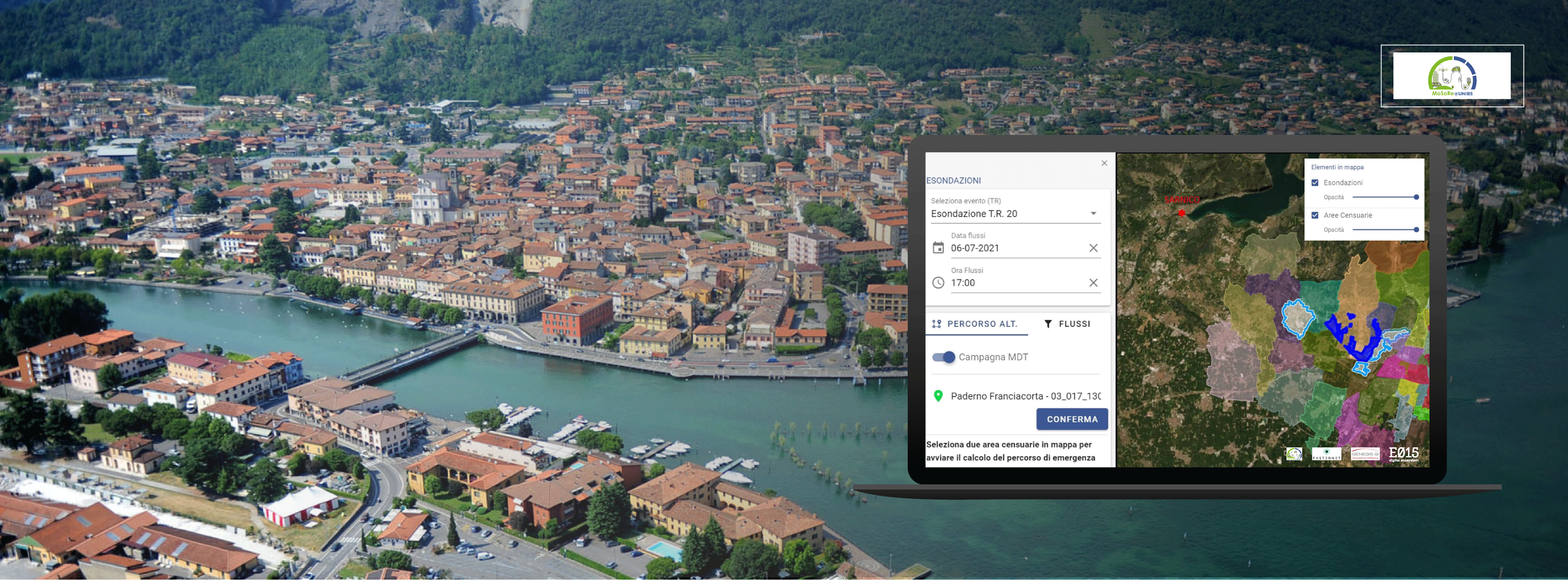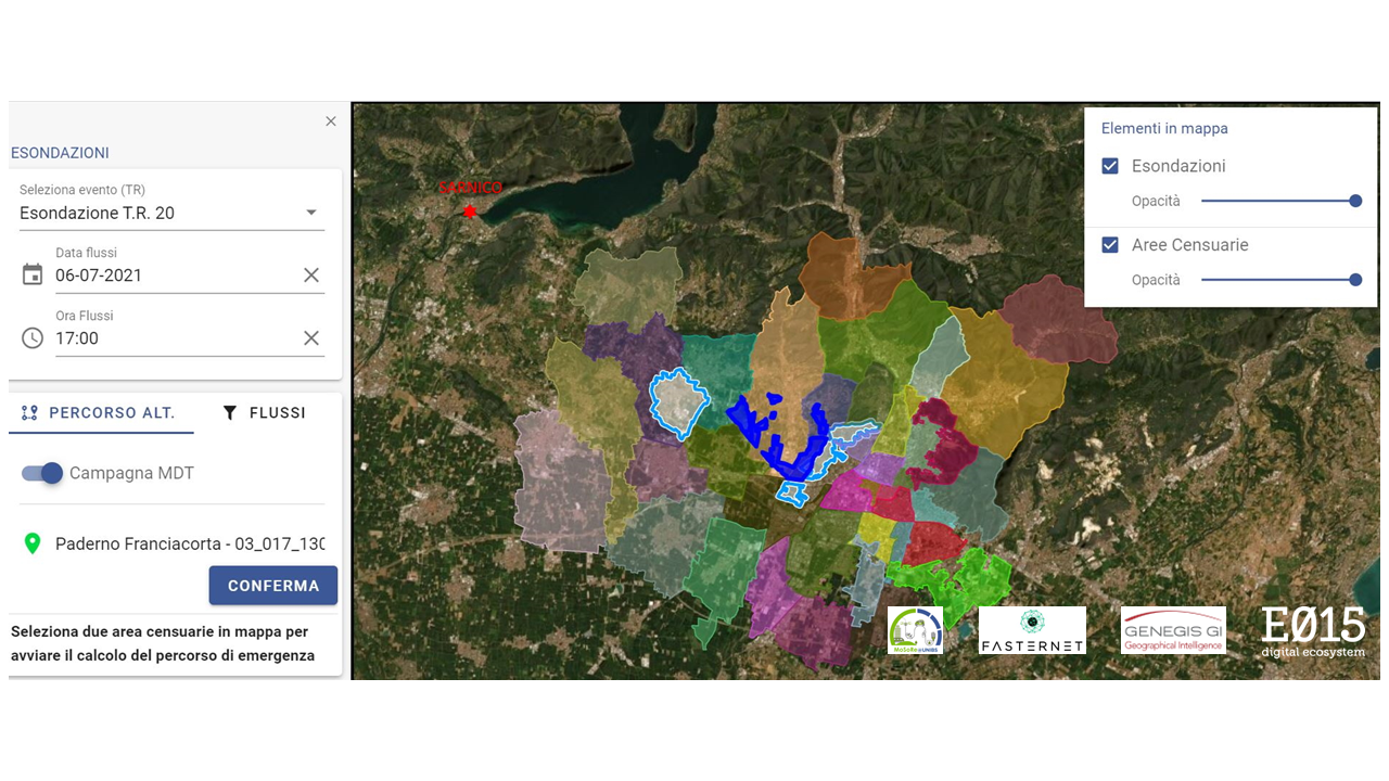 L’applicazione visualizza in cartografia la matrice di spostamento O/D relativa al nodo della Mandolossa (BS). La correlazione tra le aree di esondazione localizzate nella stessa porzione di territorio ed i flussi di spostamento consente all’applicazione di proporre dei percorsi alternativi che evitino le zone allagate.