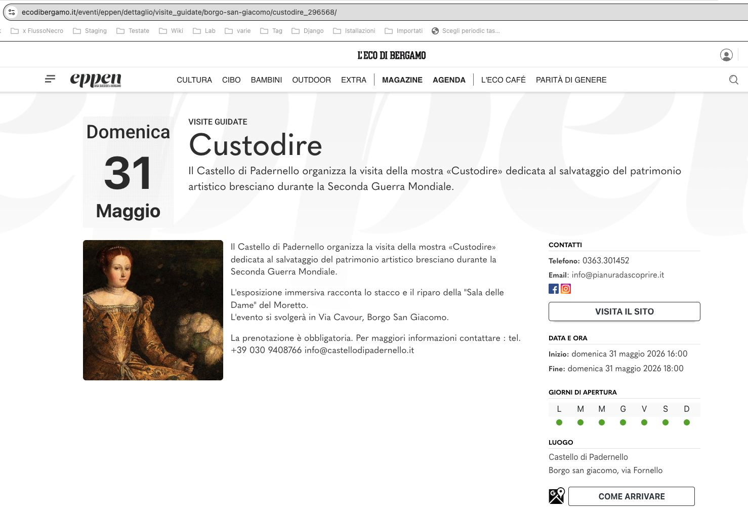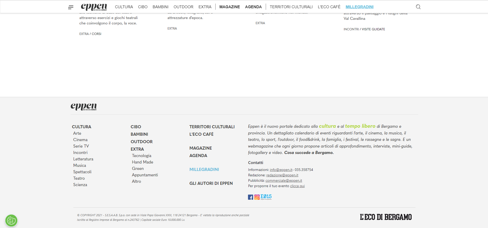 Eppen è il nuovo portale dedicato alla cultura e al tempo libero di Bergamo e provincia. Un dettagliato calendario di eventi riguardanti l'arte, il cinema, la musica, il teatro, lo sport, l'outdoor, il food&drink, la famiglia, i festival, le rassegne e le sagre. E un webmagazine che ogni giorno propone articoli di approfondimento, interviste, mini-guide, fotogallery e video. Cosa succede a Bergamo.