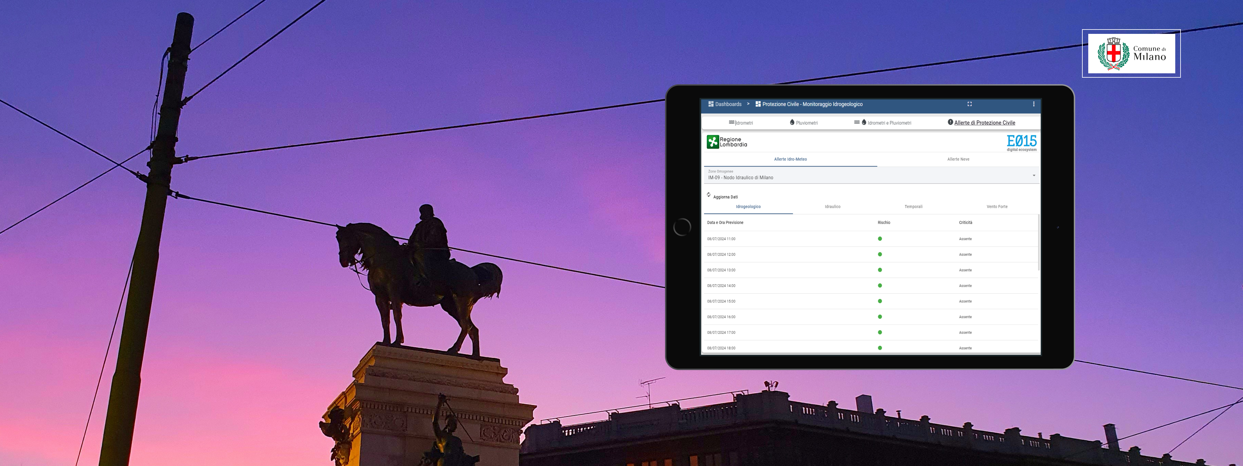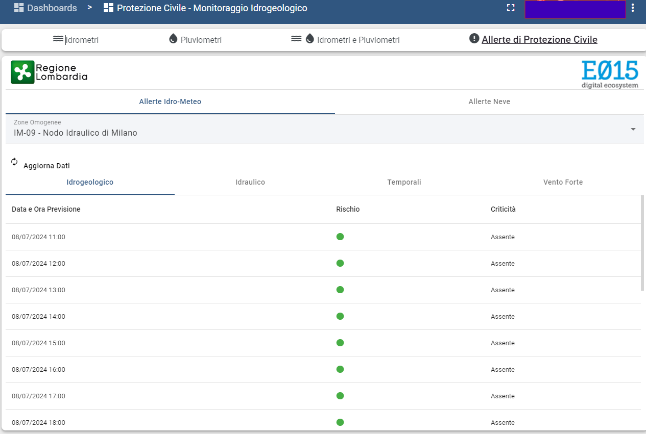 Cruscotto di monitoraggio dello stato delle allerte della protezione civile - uso interno al comune di Milano