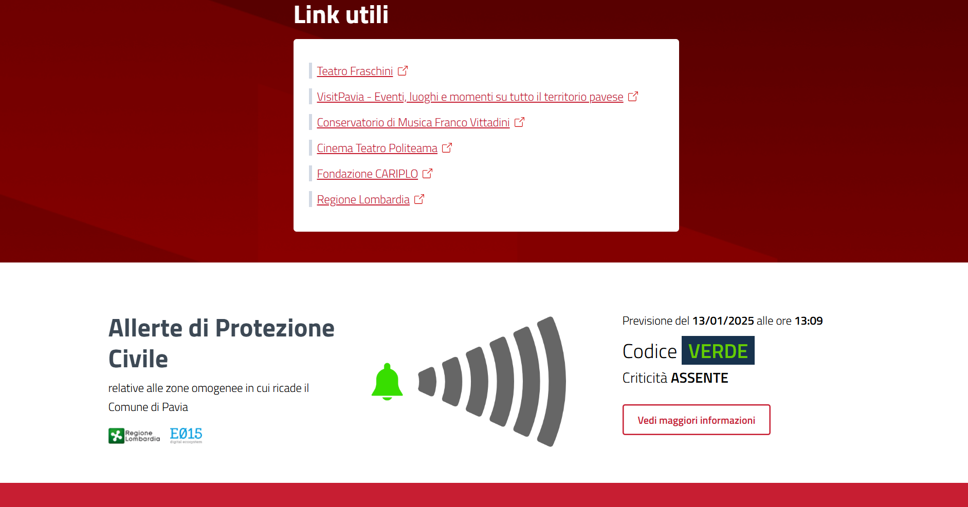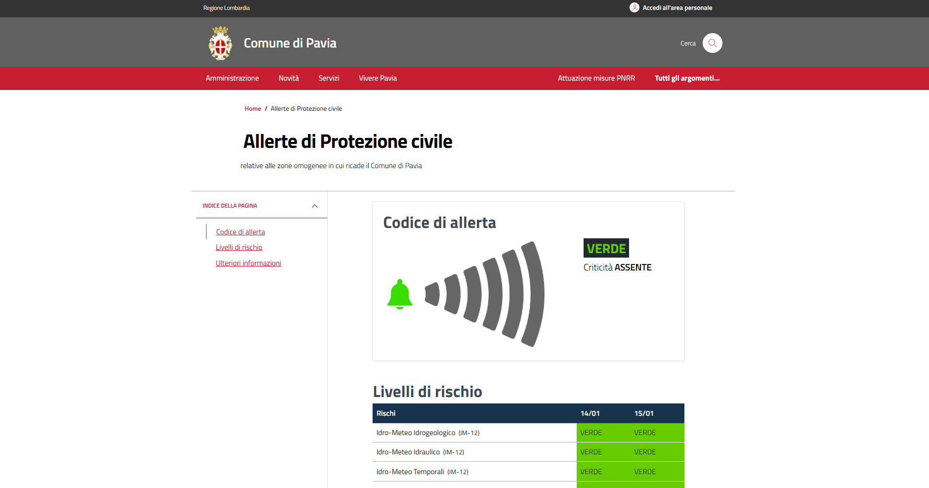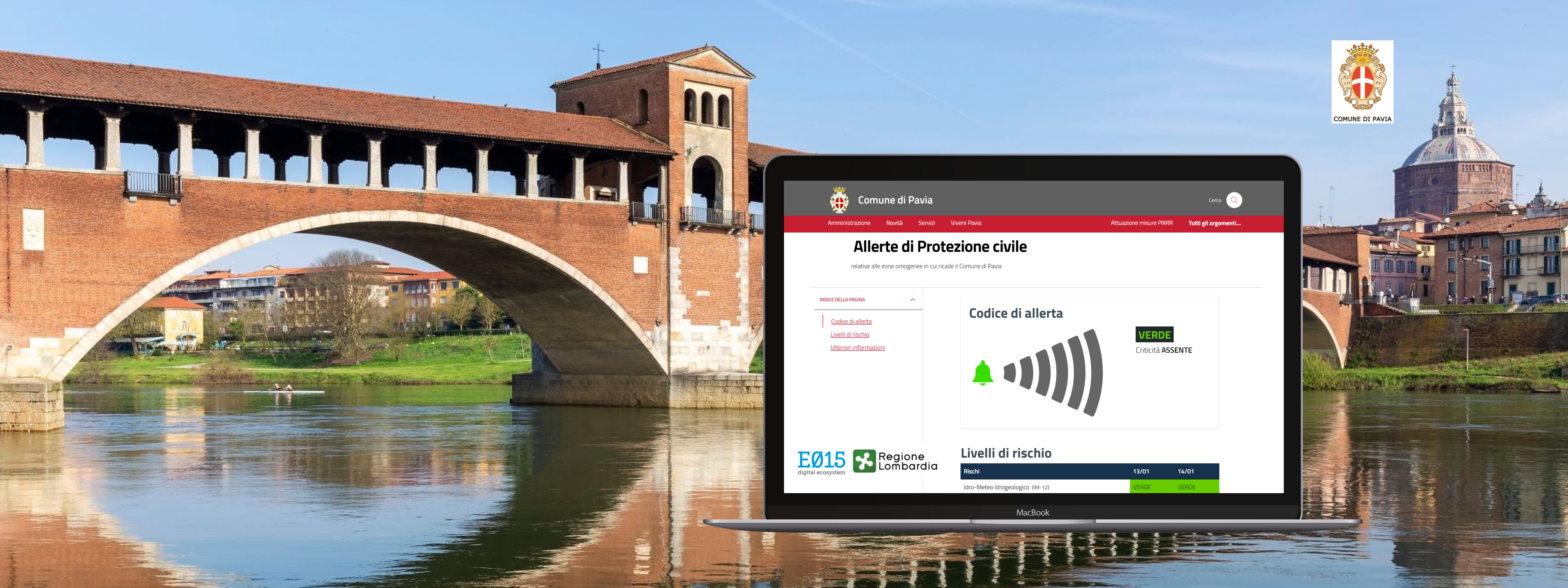 Sito istituzionale del Comune di Pavia. Sul sito vengono mostrate le allerte di Protezione Civile provenienti dall'ecosistema E015 e fornisce le API sugli eventi nella città di Pavia.