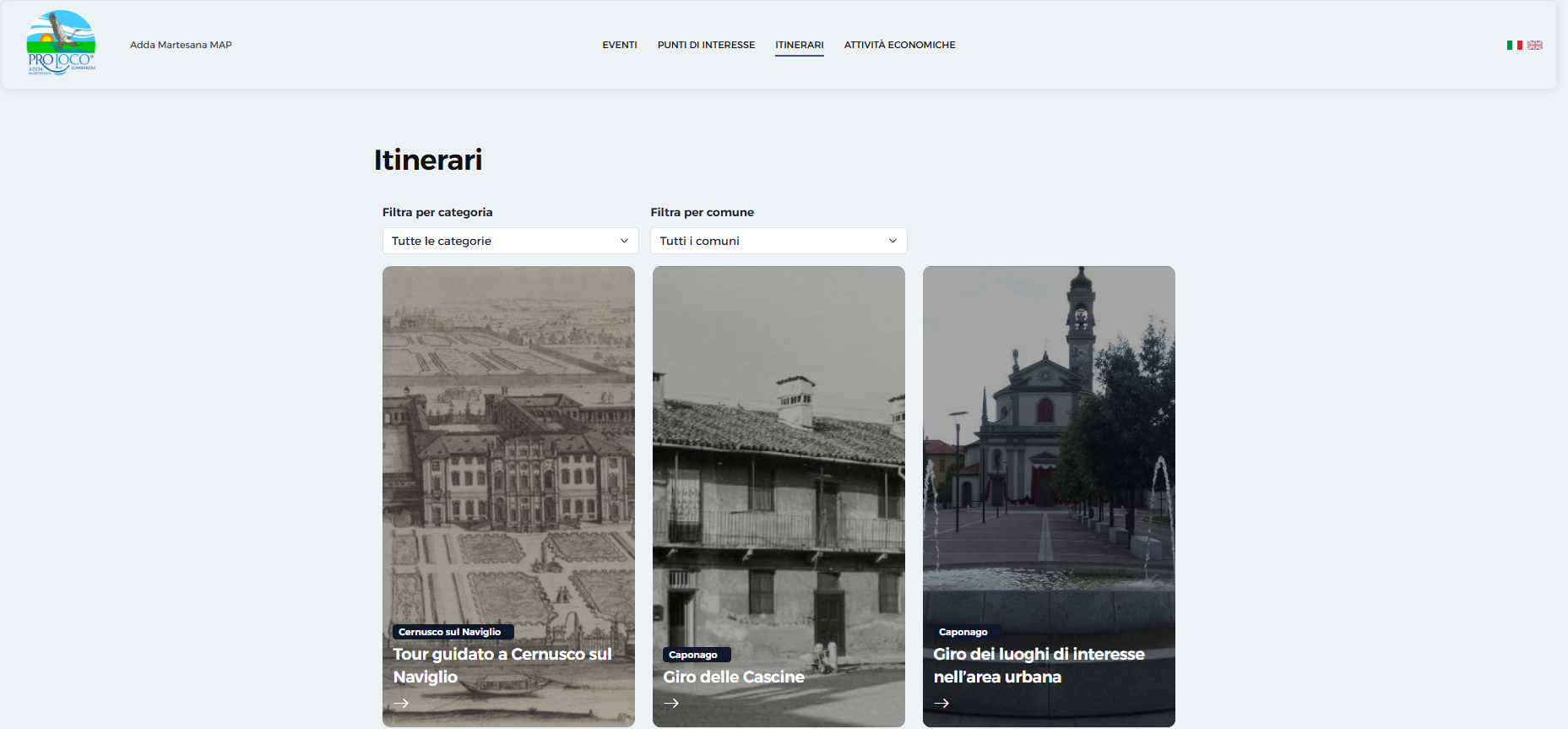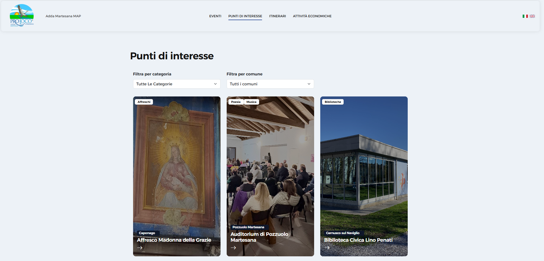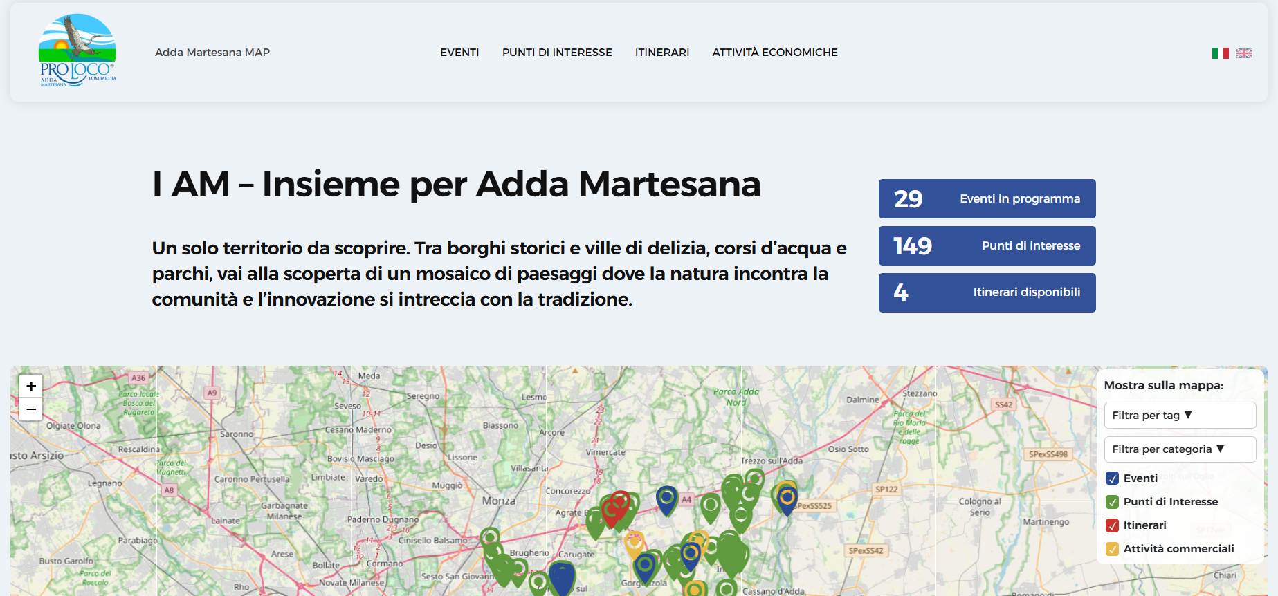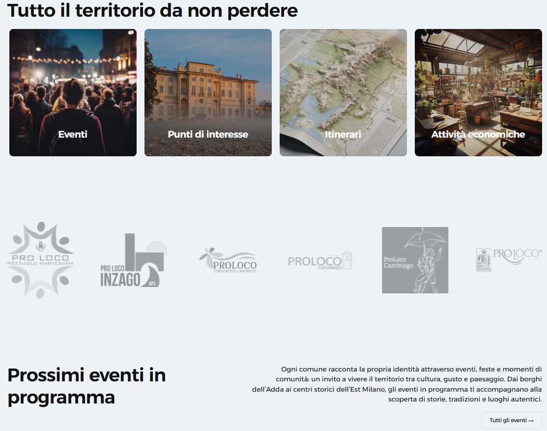 Webapp gestita dalle 16 pro loco del territorio Adda Martesana associate al Comitato Regionale UNPLI Lombardia. La web app accessibile da qualsiasi dispositivo digitale promuove Eventi, Punti di Interesse, Itinerari e Attività Commerciali del territorio lombardo alla coincidenza tra il fiume Adda ed il Canale Martesana, coprendo in gran parte la zona orientale della Città Metropolitana di Milano.