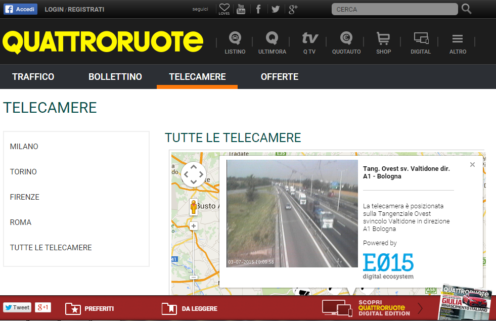 All'interno dell'area QTraffic del sito Quattroruote.it, vengono mostrate su mappa le immagini delle telecamere del traffico fornite dalla società Milano Serravalle-Milano Tangenziali tramite l'Ecosistema Digitale E015.