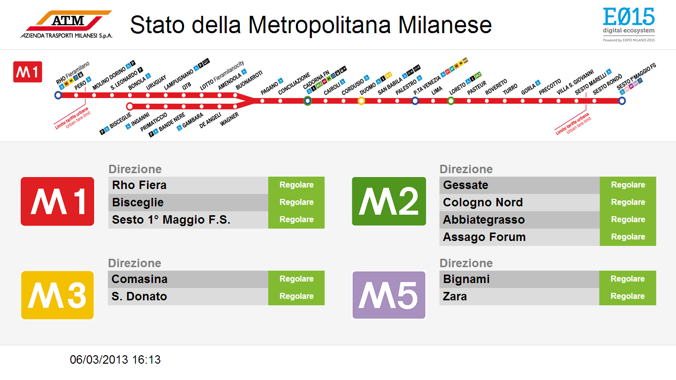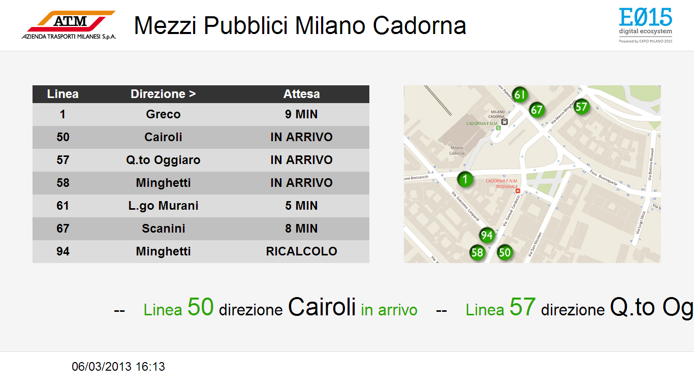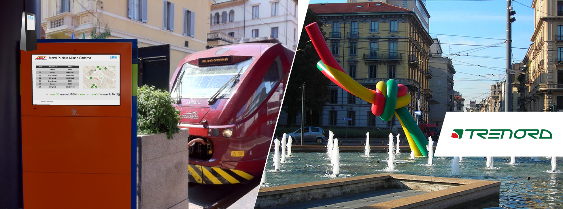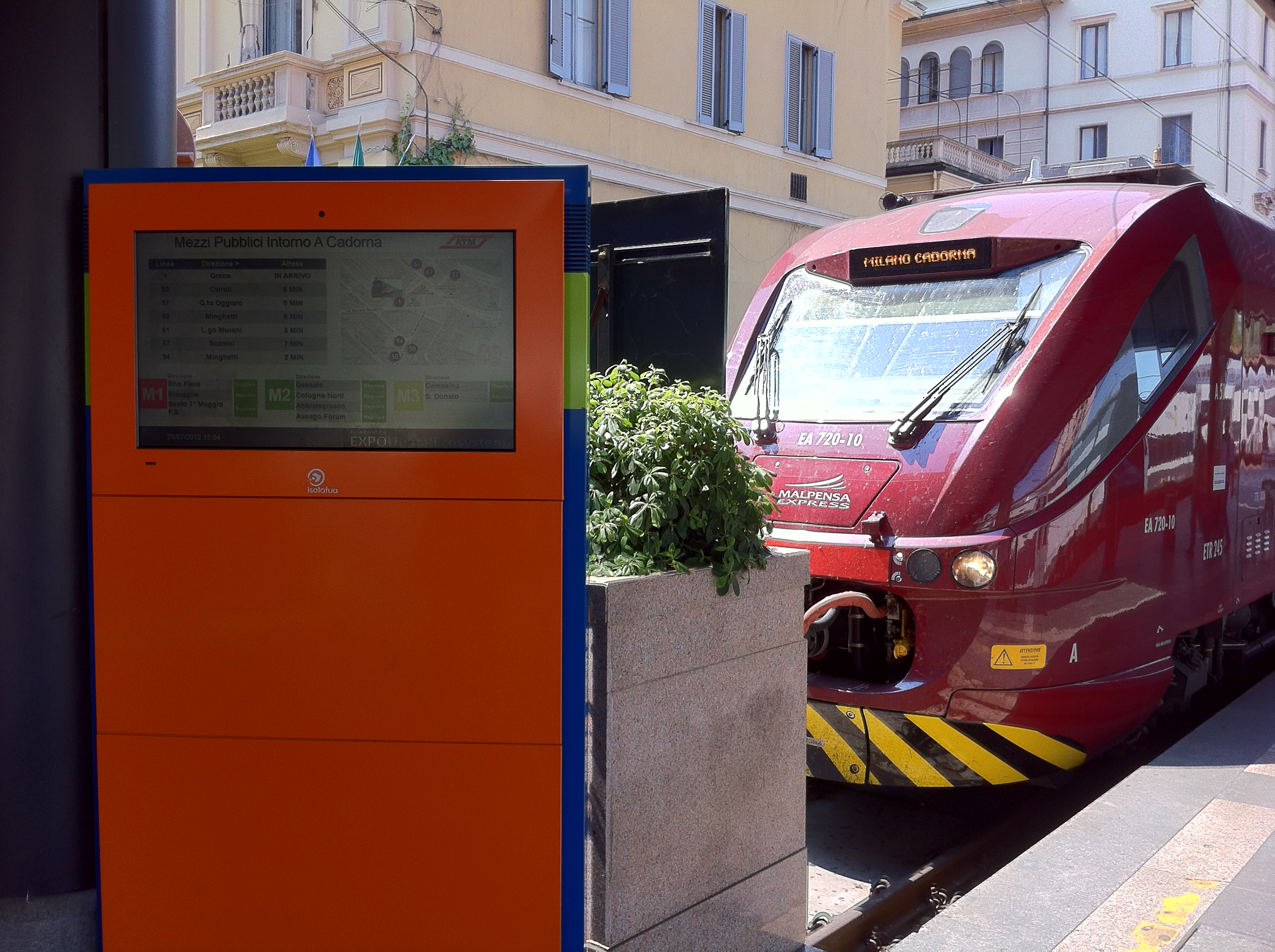 Esposizione sugli schermi posti su alcuni totem informativi presso la stazione di Milano Cadorna delle informazioni SEA (arrivi/partenze da Malpensa) e delle informazioni ATM (stato circolazione metropolitane e bus limitrofi a Cadorna).